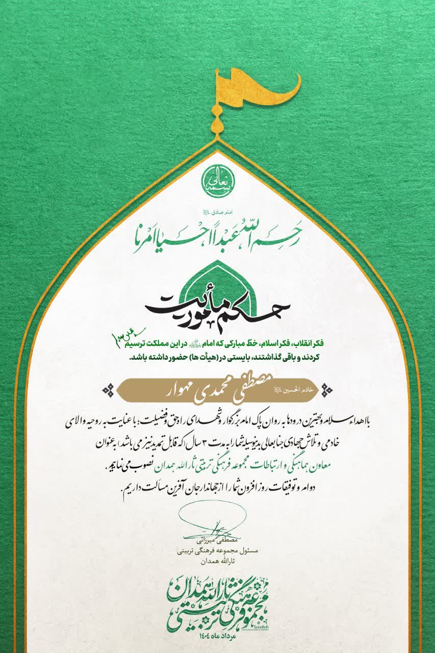 «نظر به تعهد، تخصص و سوابق ارزشمند جنابعالی در عرصههای فرهنگی و اجتماعی، به موجب این حکم به سمت معاون هماهنگی و ارتباطات مجموعه فرهنگی تربیتی ثارالله استان همدان منصوب میشوید. امید است با اتکال به خداوند متعال و بهرهگیری از ظرفیت جوانان مؤمن و انقلابی، در پیشبرد اهداف مجموعه و ارتقای سطح ارتباطات فرهنگی، موفق و مؤید باشید.»